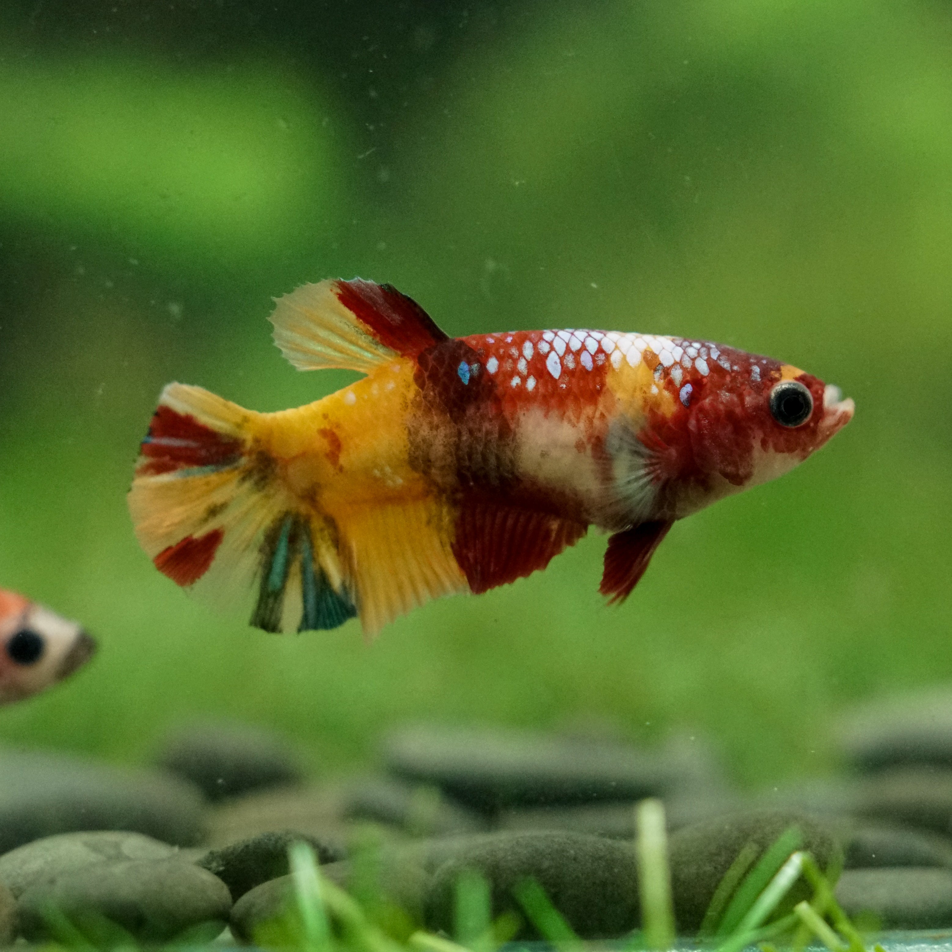 Please keep in mind that you are looking at the fish at young age and is still growing. Under good care, your Galaxy koi betta will become a beautiful fish with rich and vibrant colors.