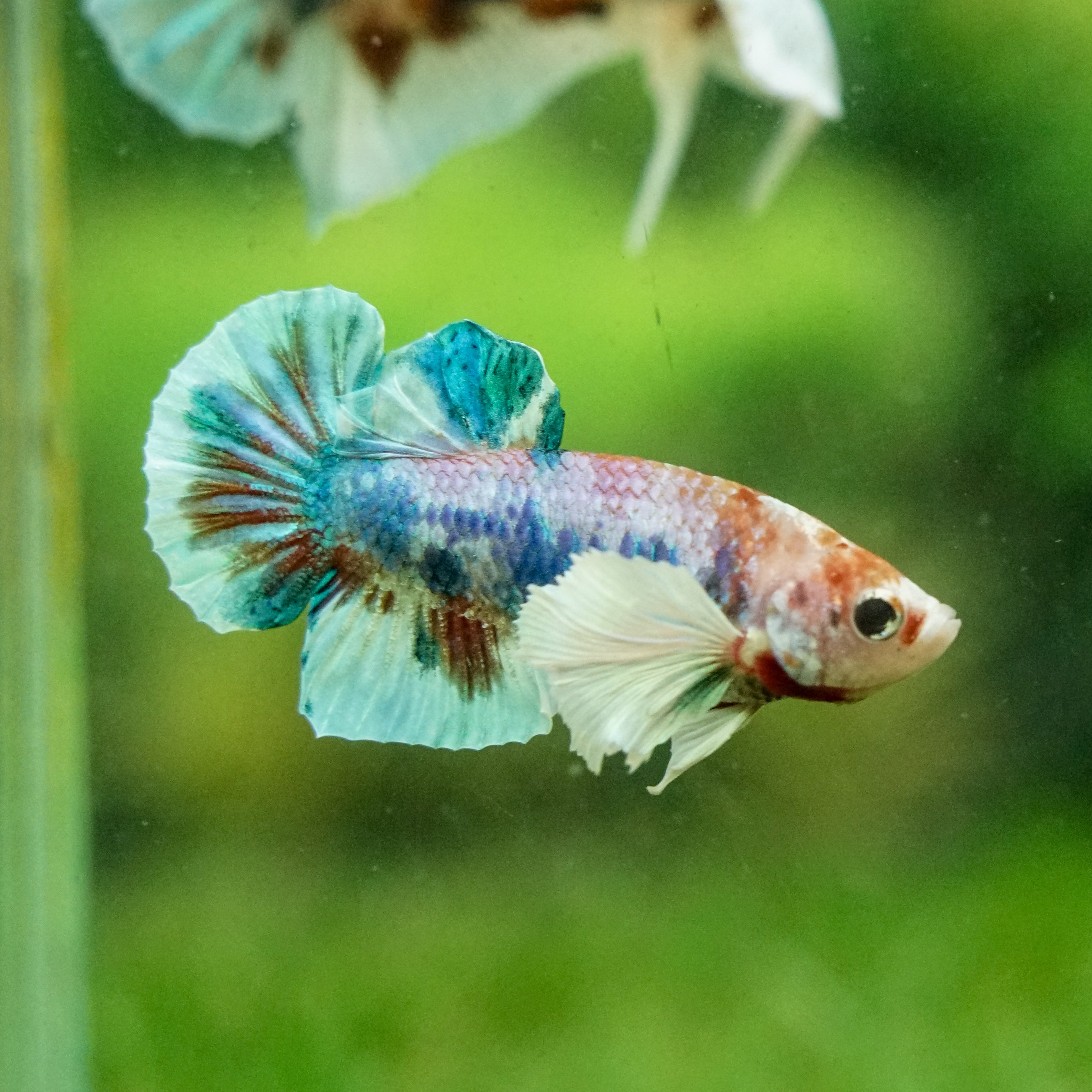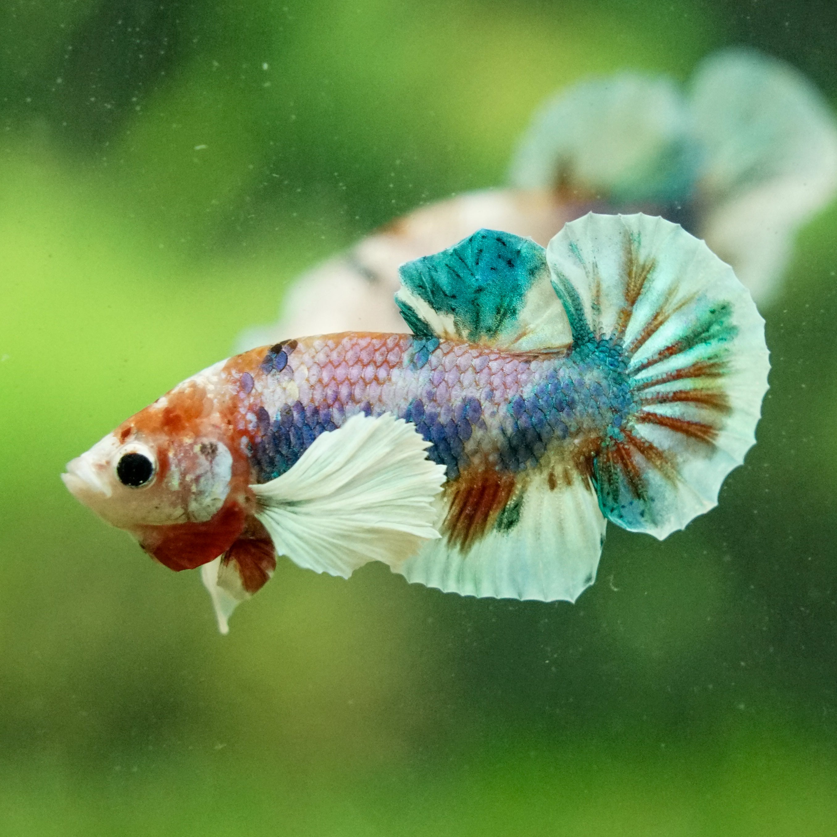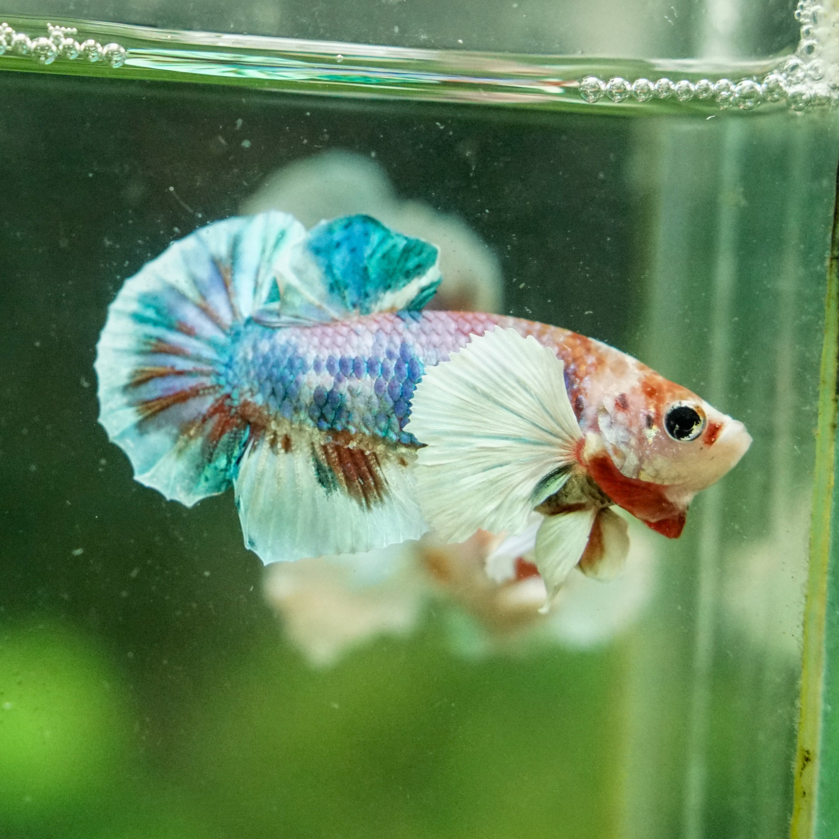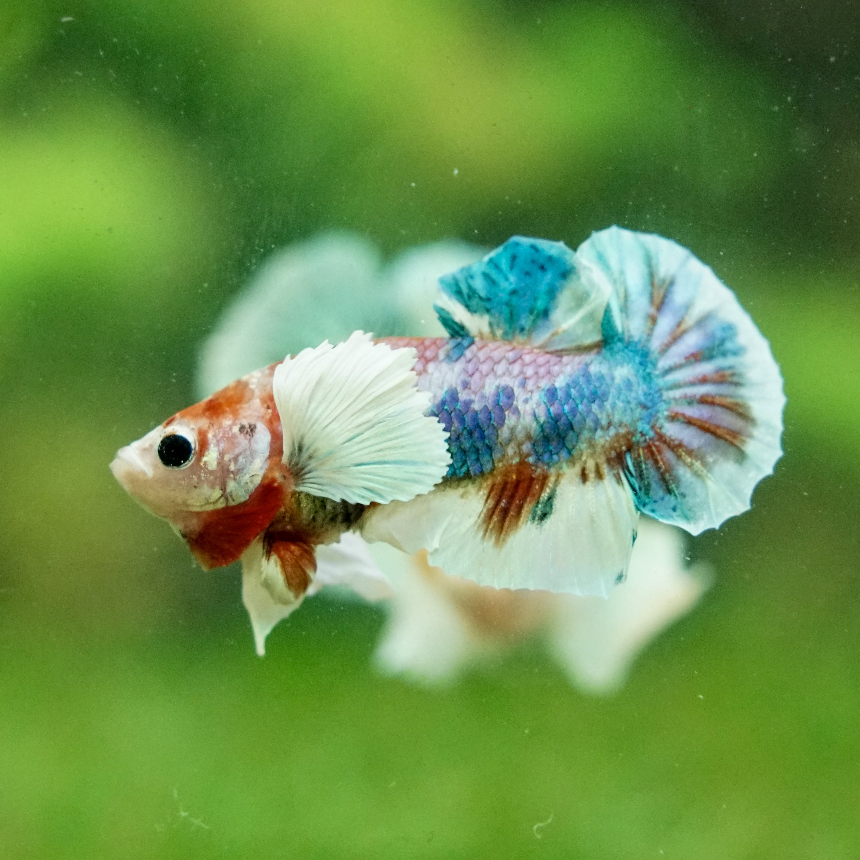 This betta has metallic scales, therefore his/her galaxy scales will appear/shine slightly different under different lighting angles