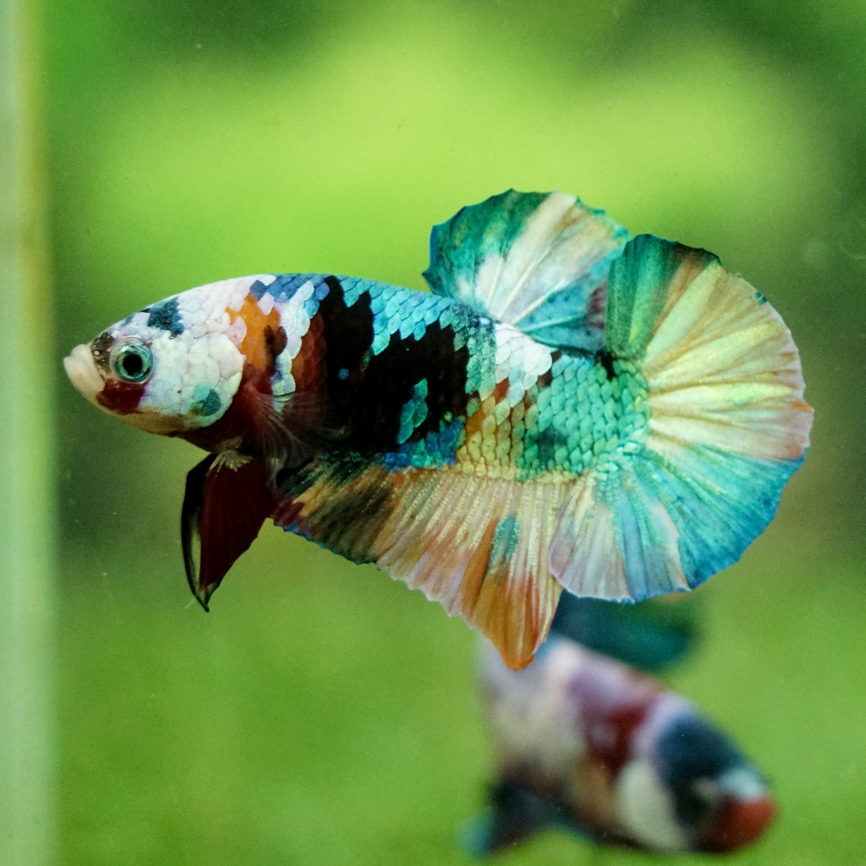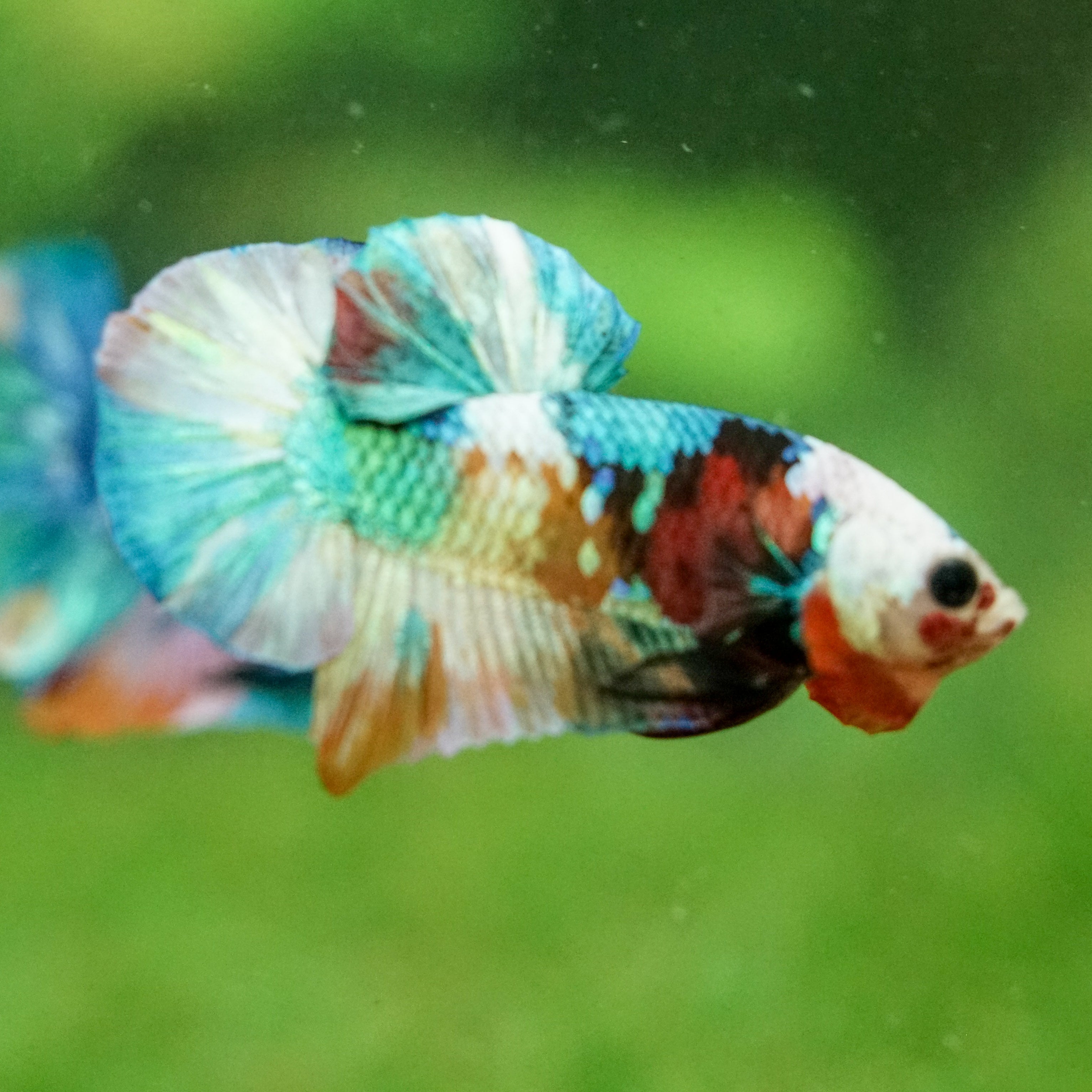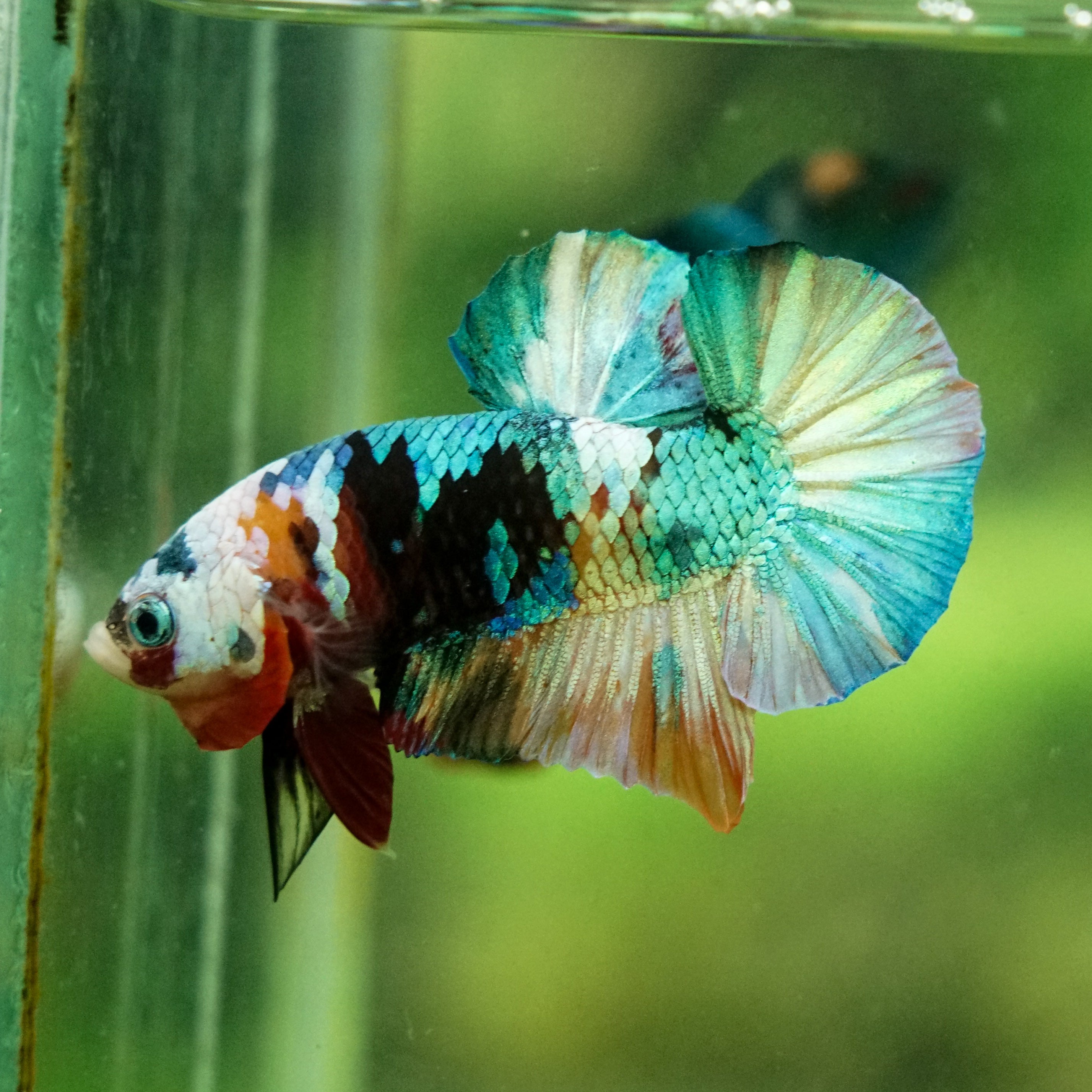 This betta has metallic scales, therefore his/her galaxy scales will appear/shine slightly different under different lighting angles