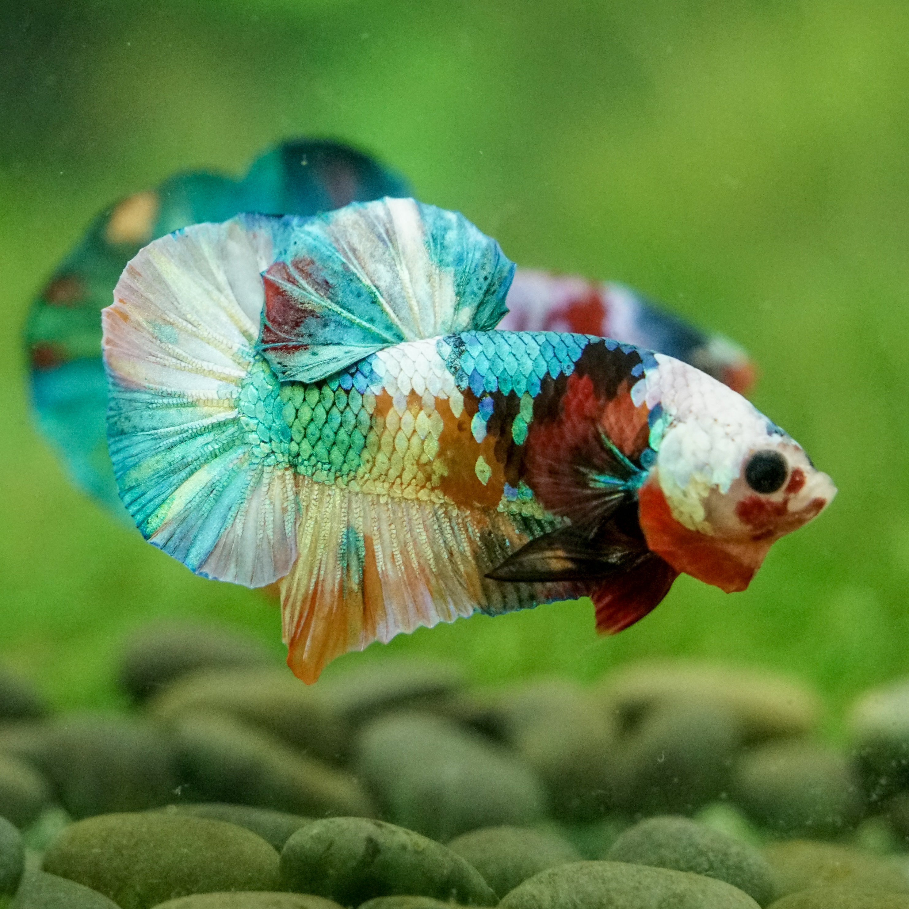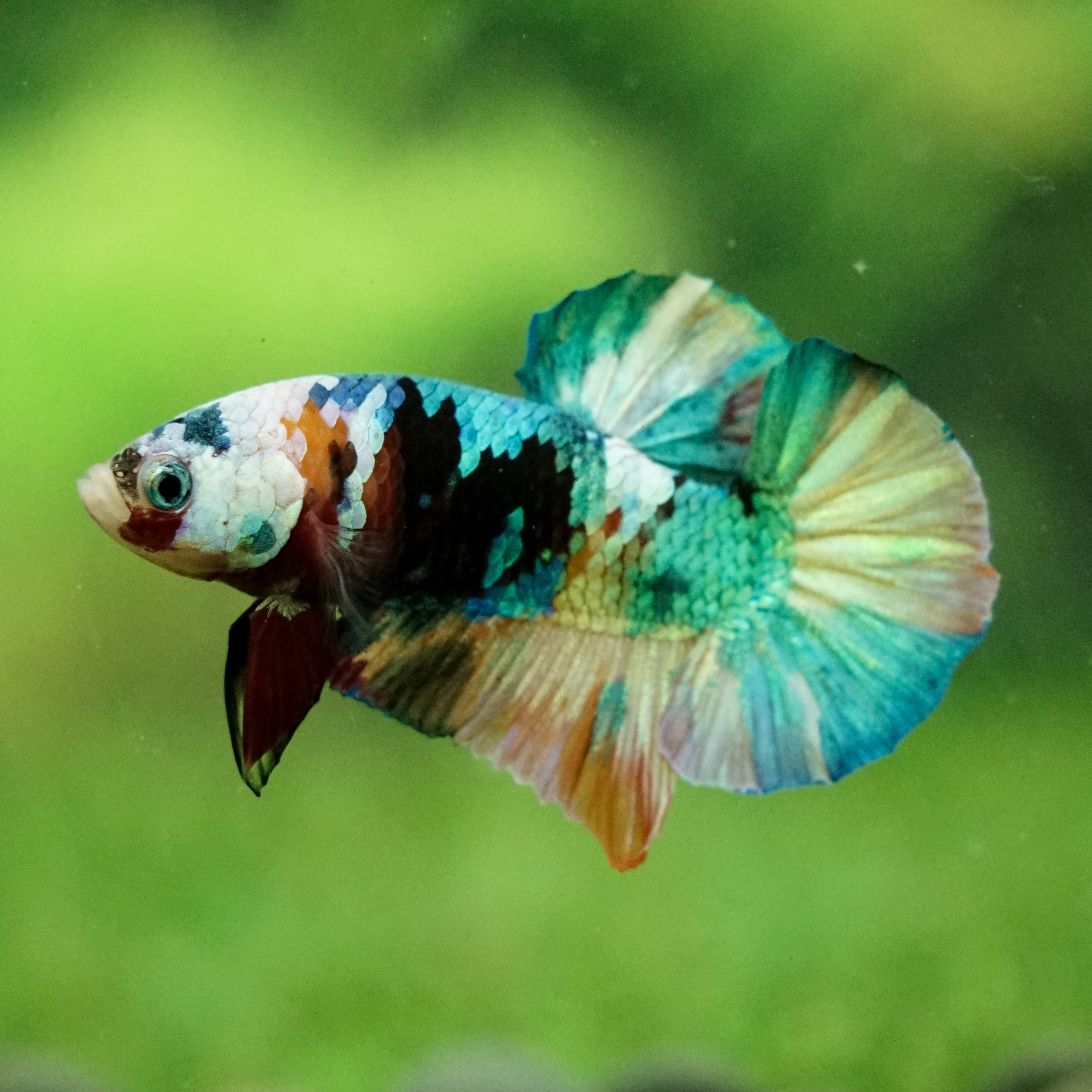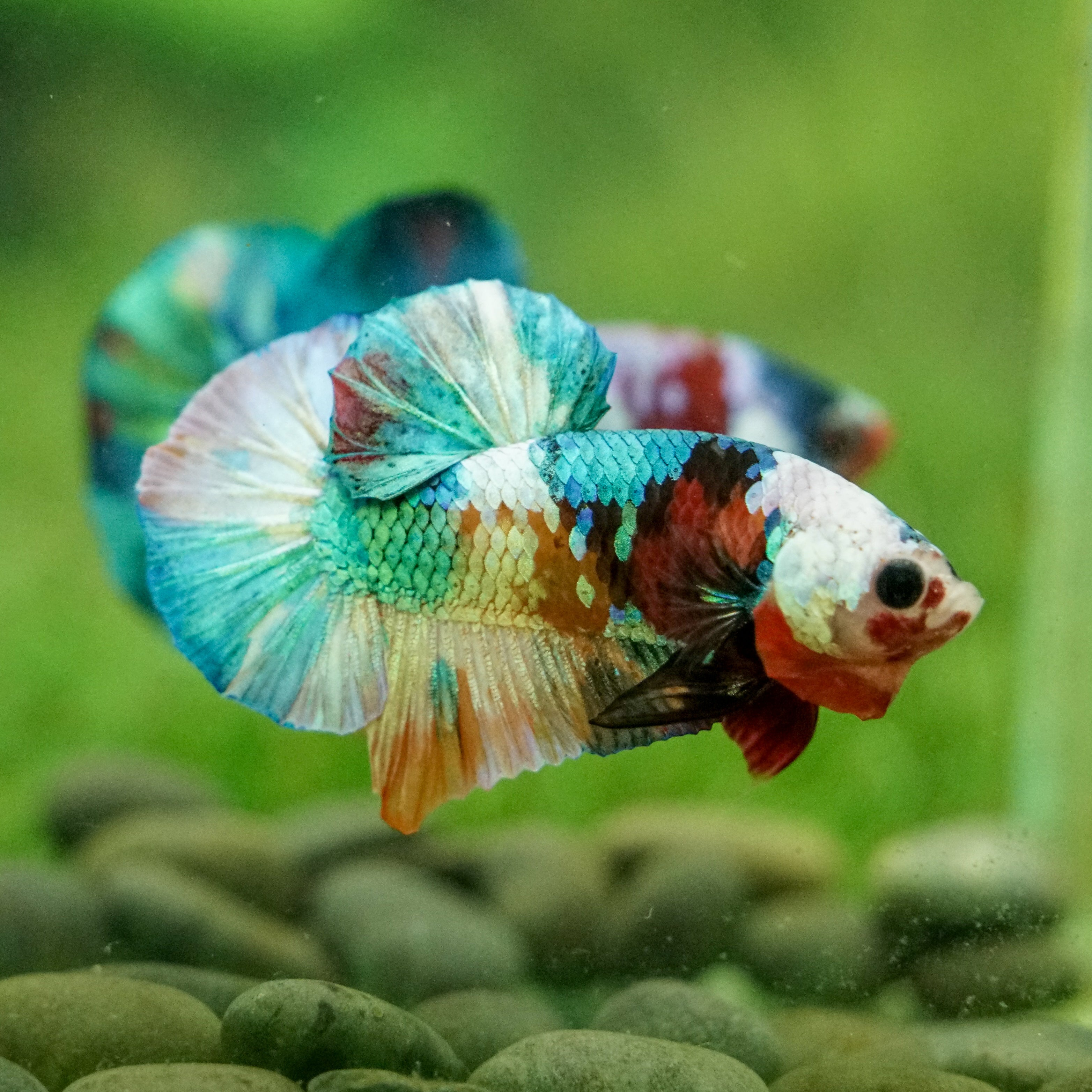 This betta has metallic scales, therefore his/her galaxy scales will appear/shine slightly different under different lighting angles