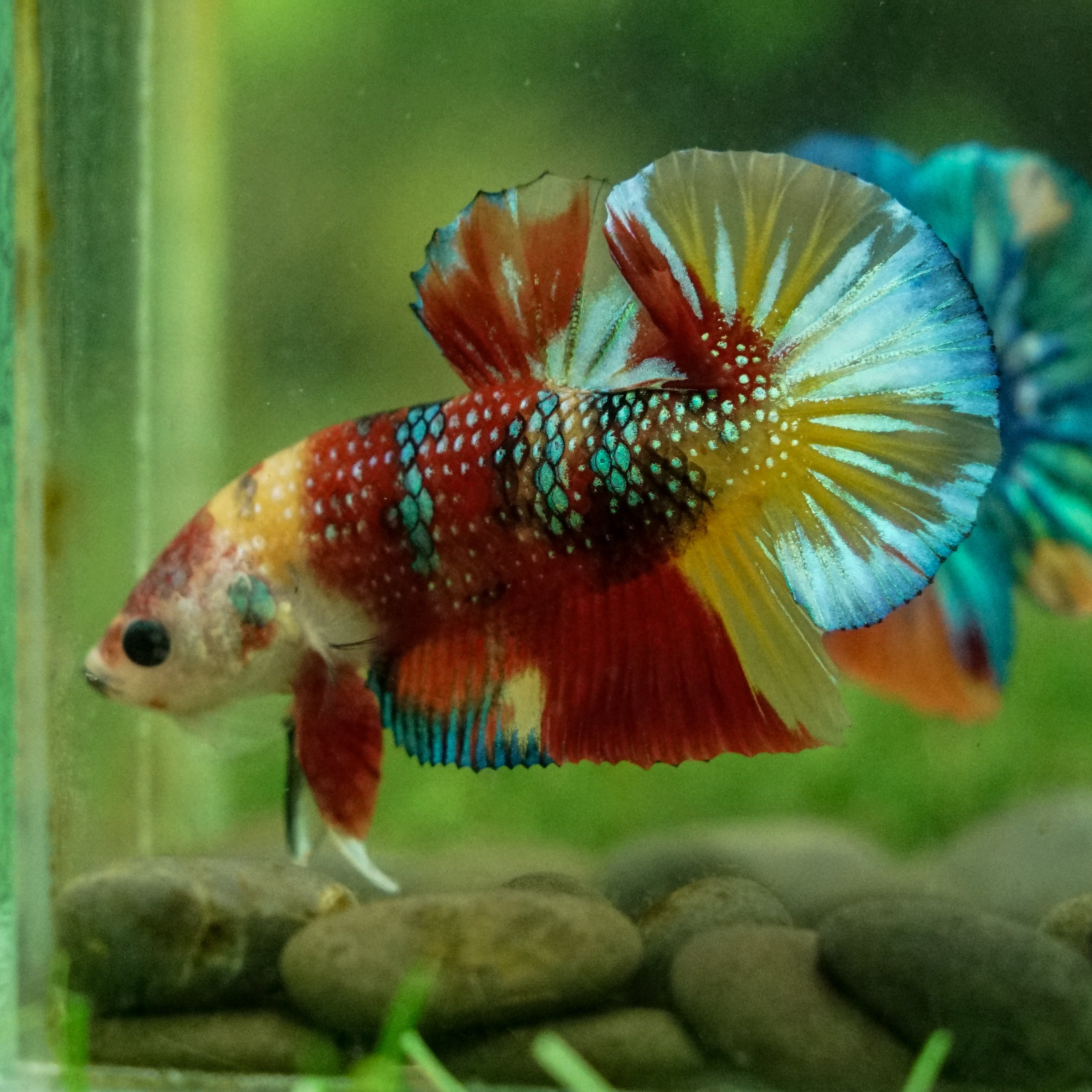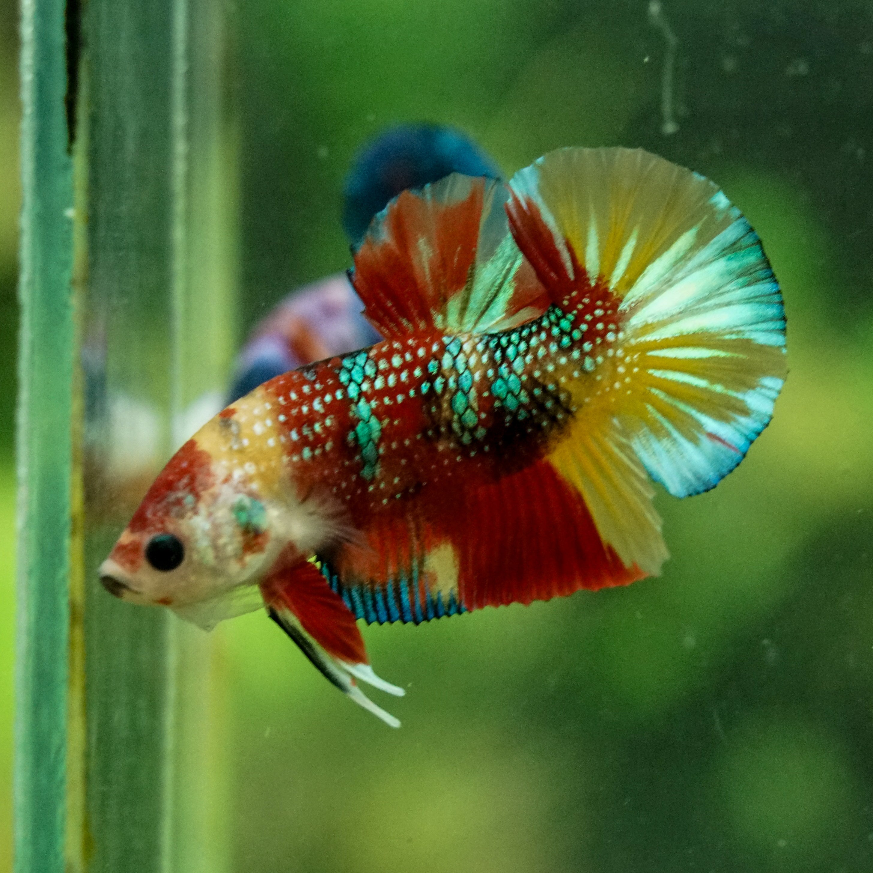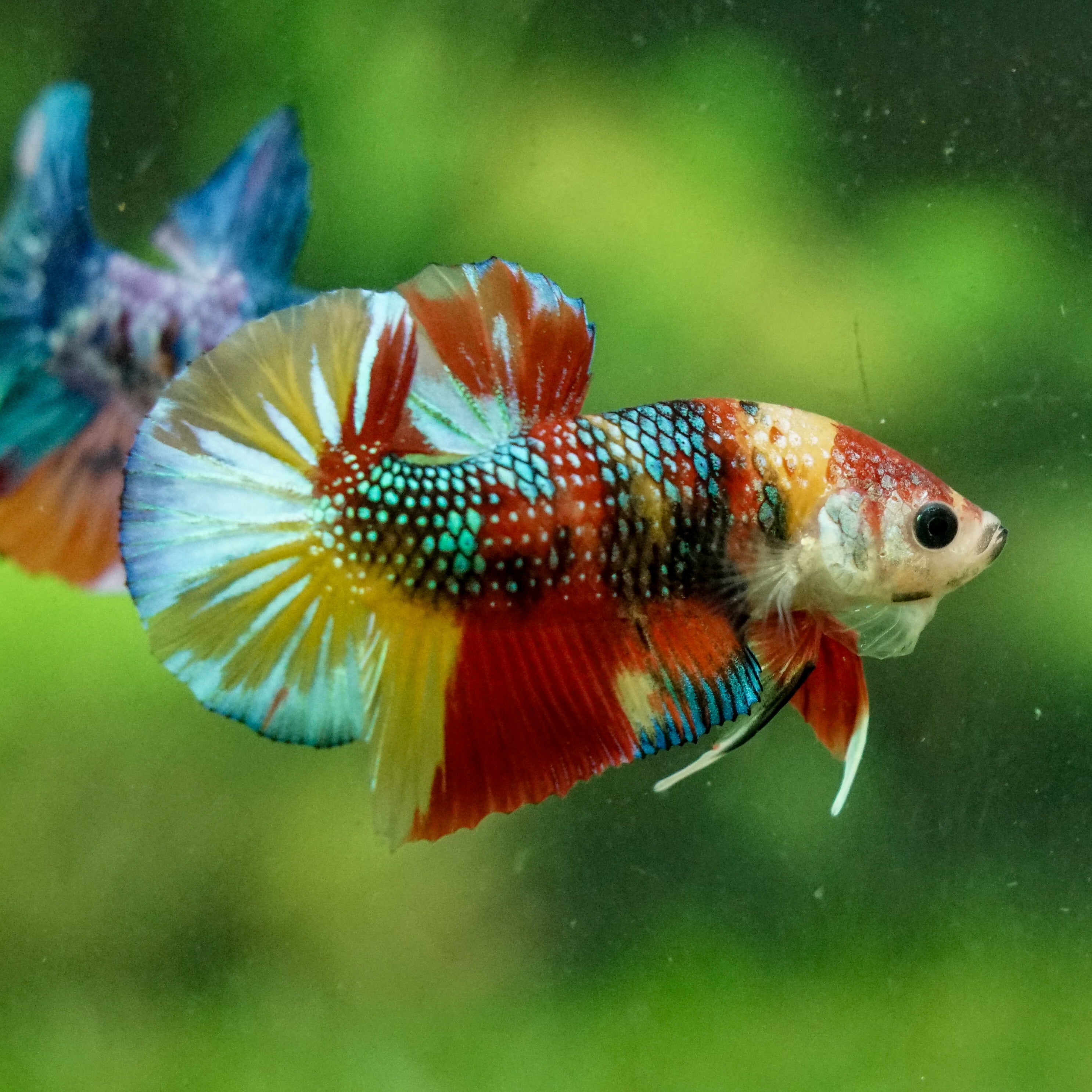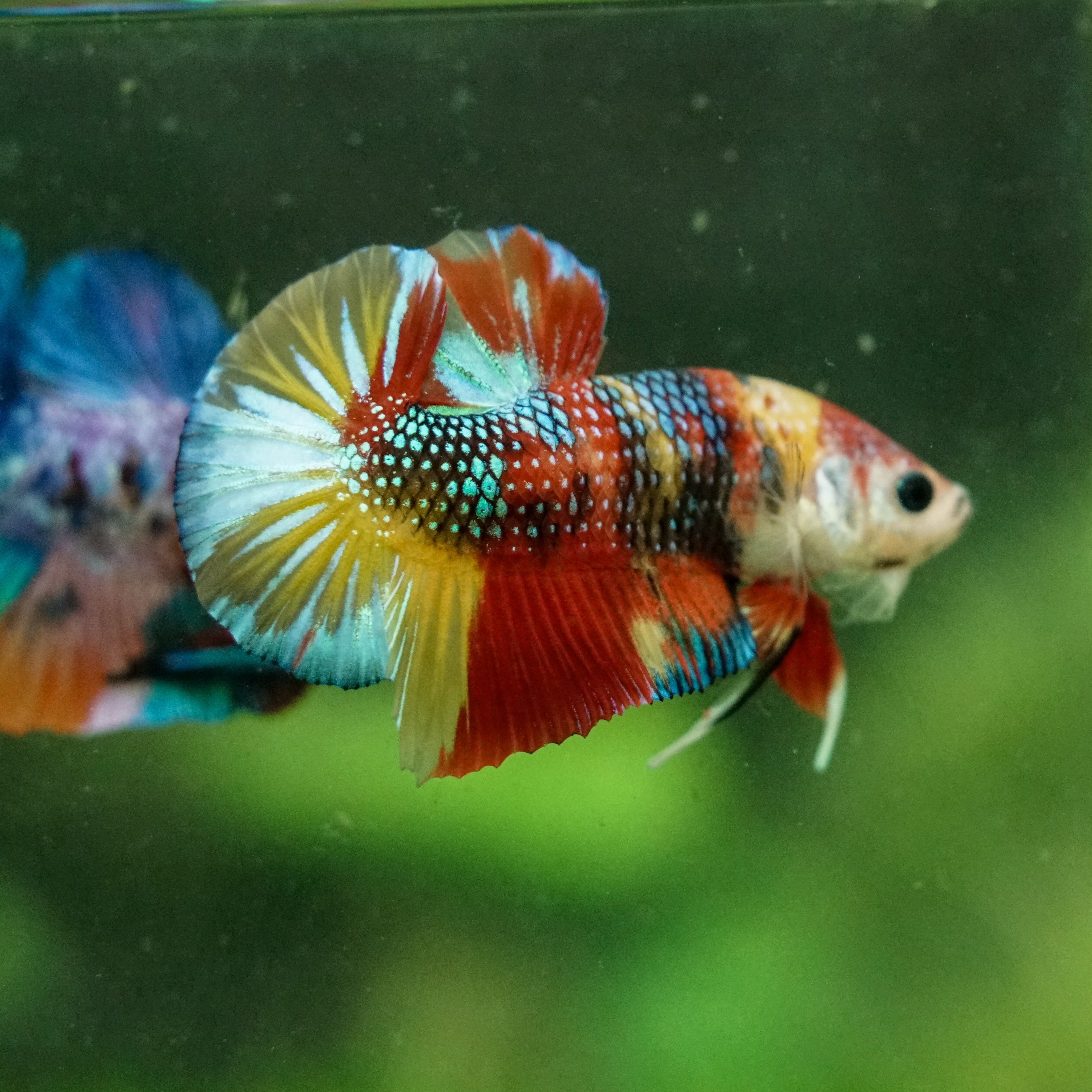This betta has metallic scales, therefore his/her galaxy scales will appear/shine slightly different under different lighting angles
