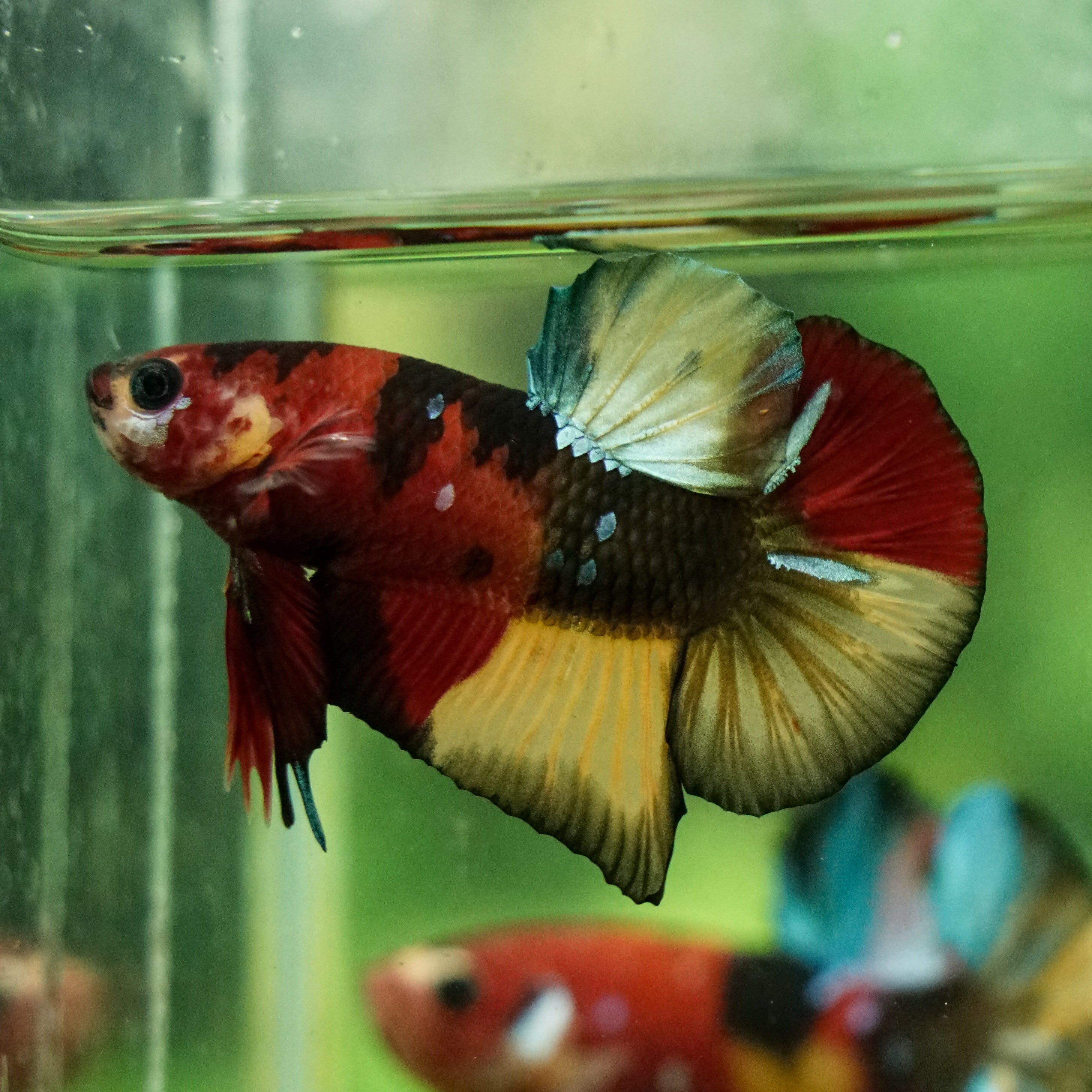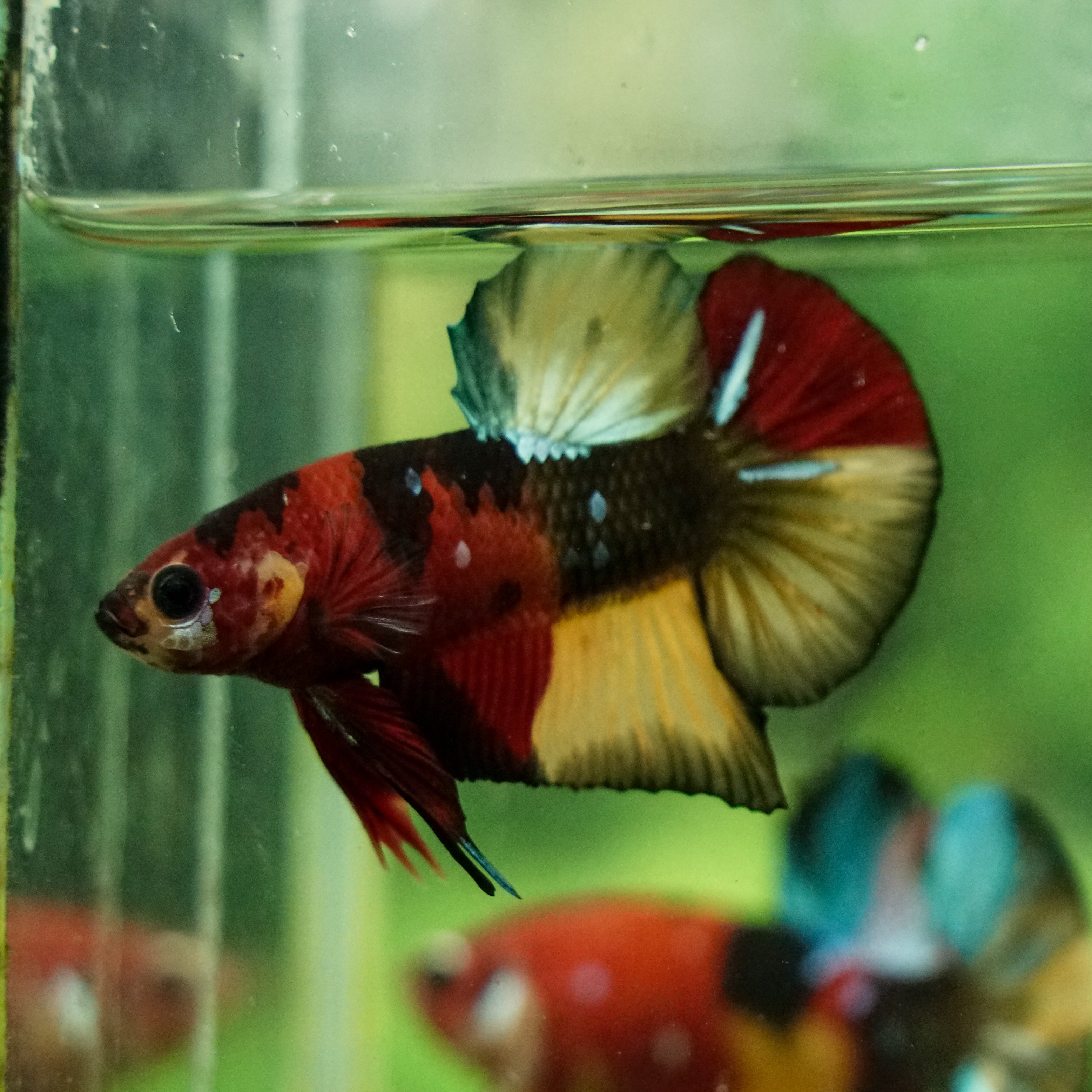 This betta has metallic scales, therefore his/her galaxy scales will appear/shine slightly different under different lighting angles