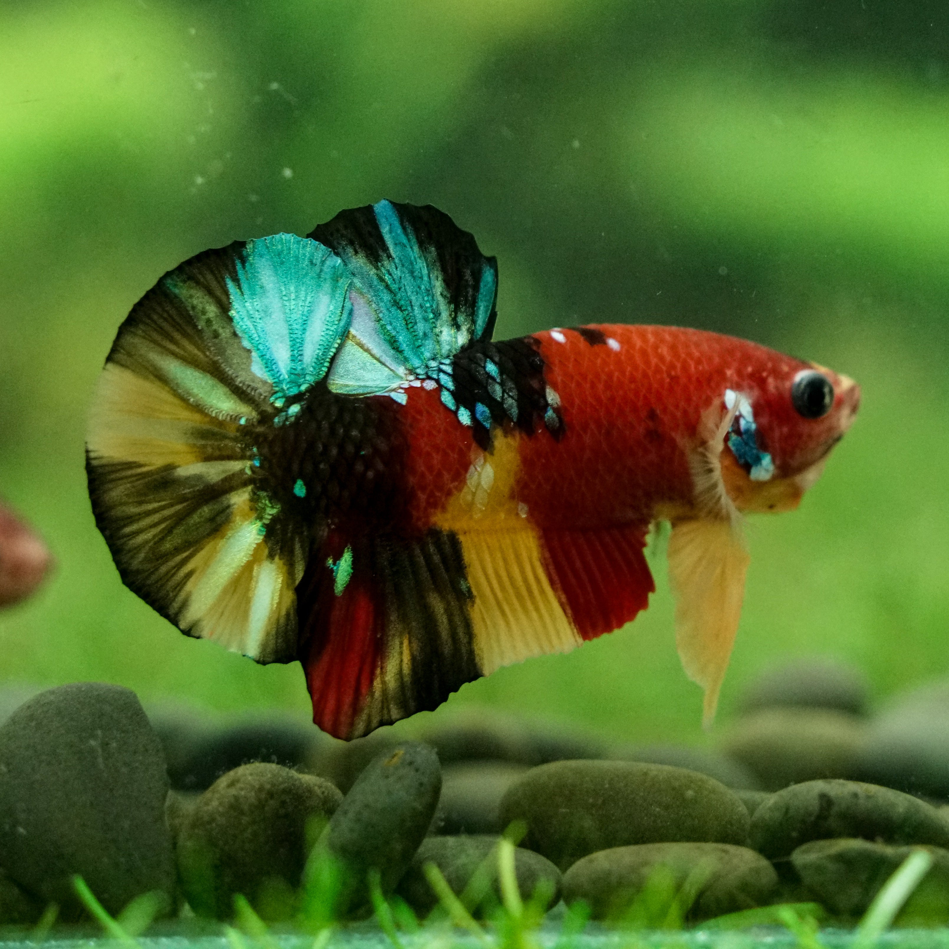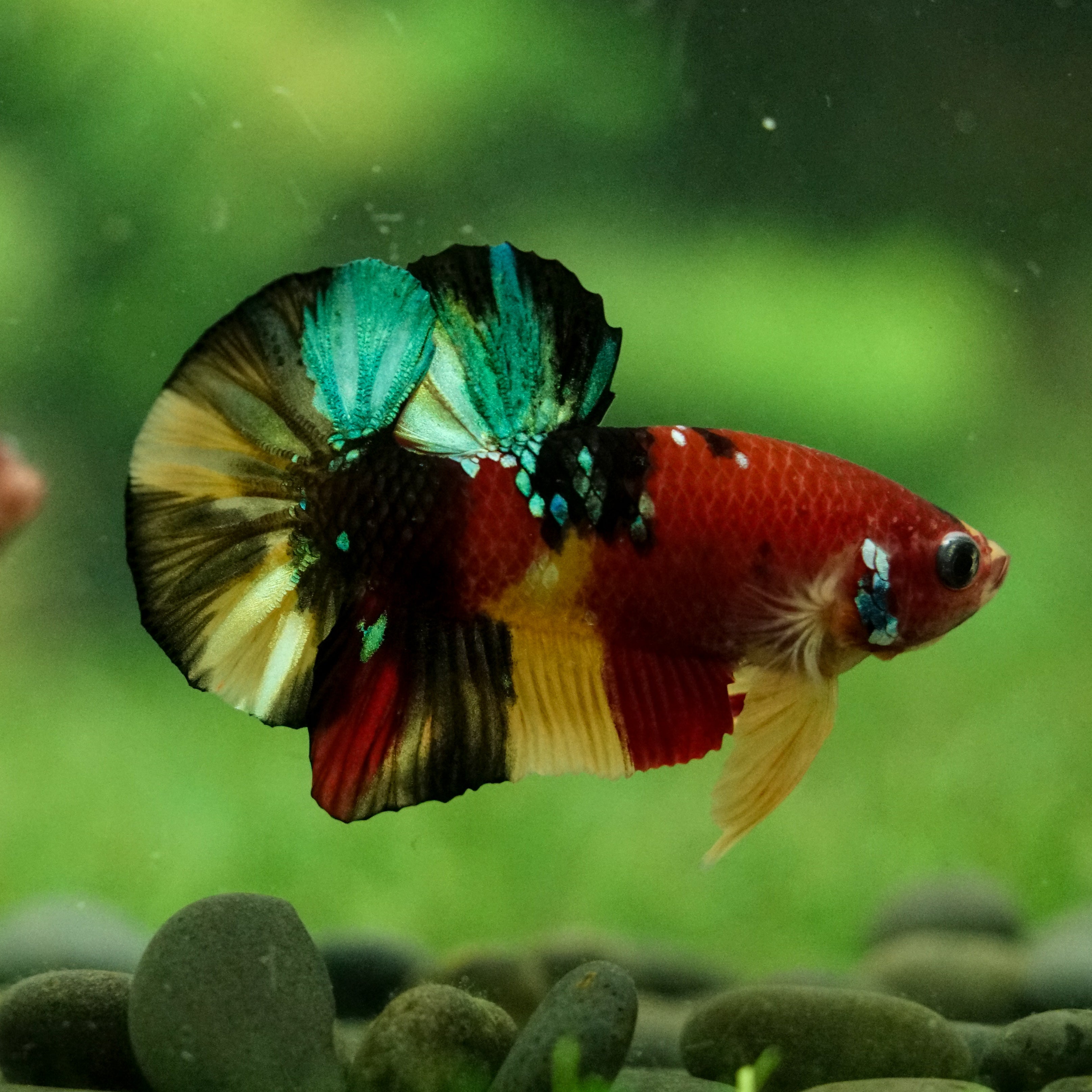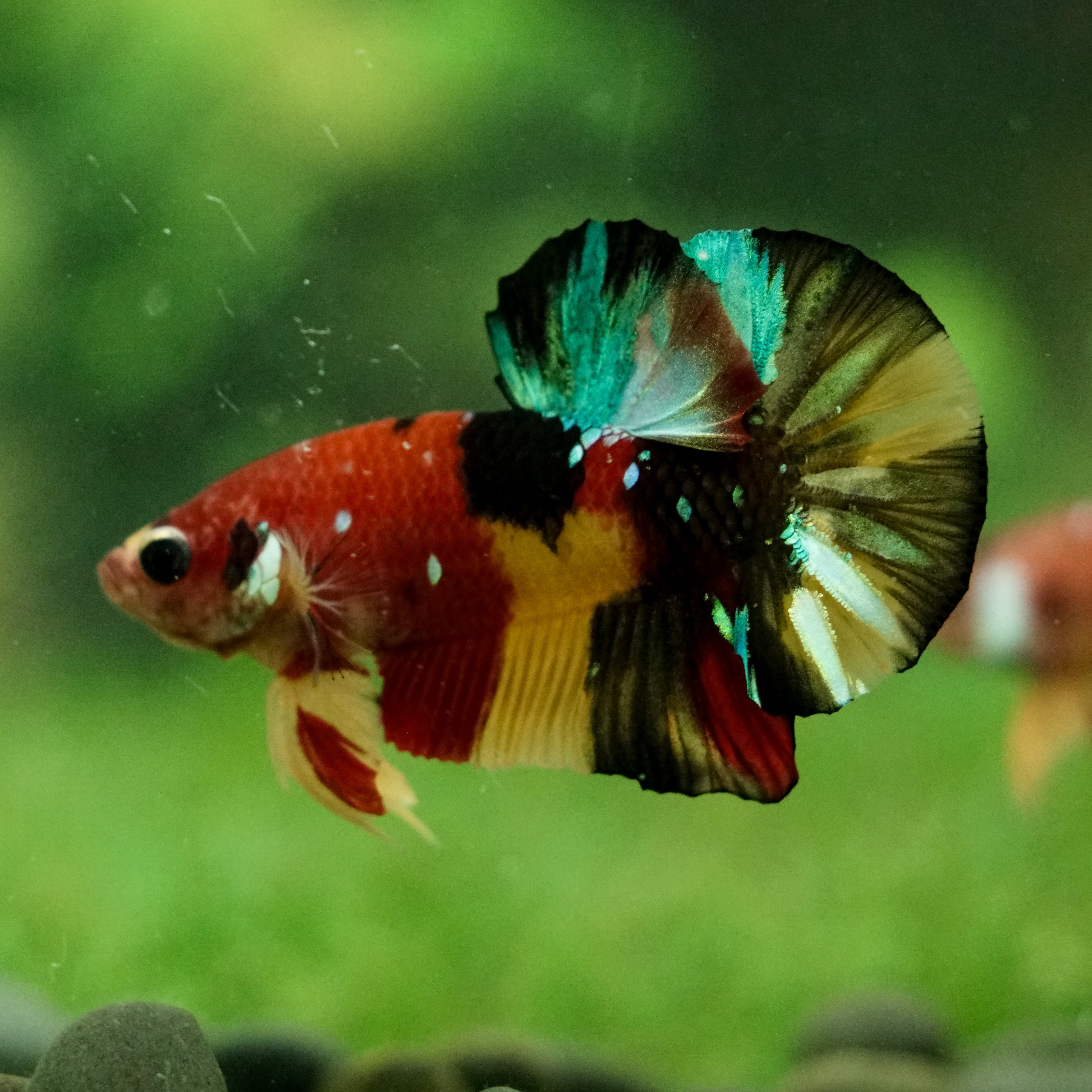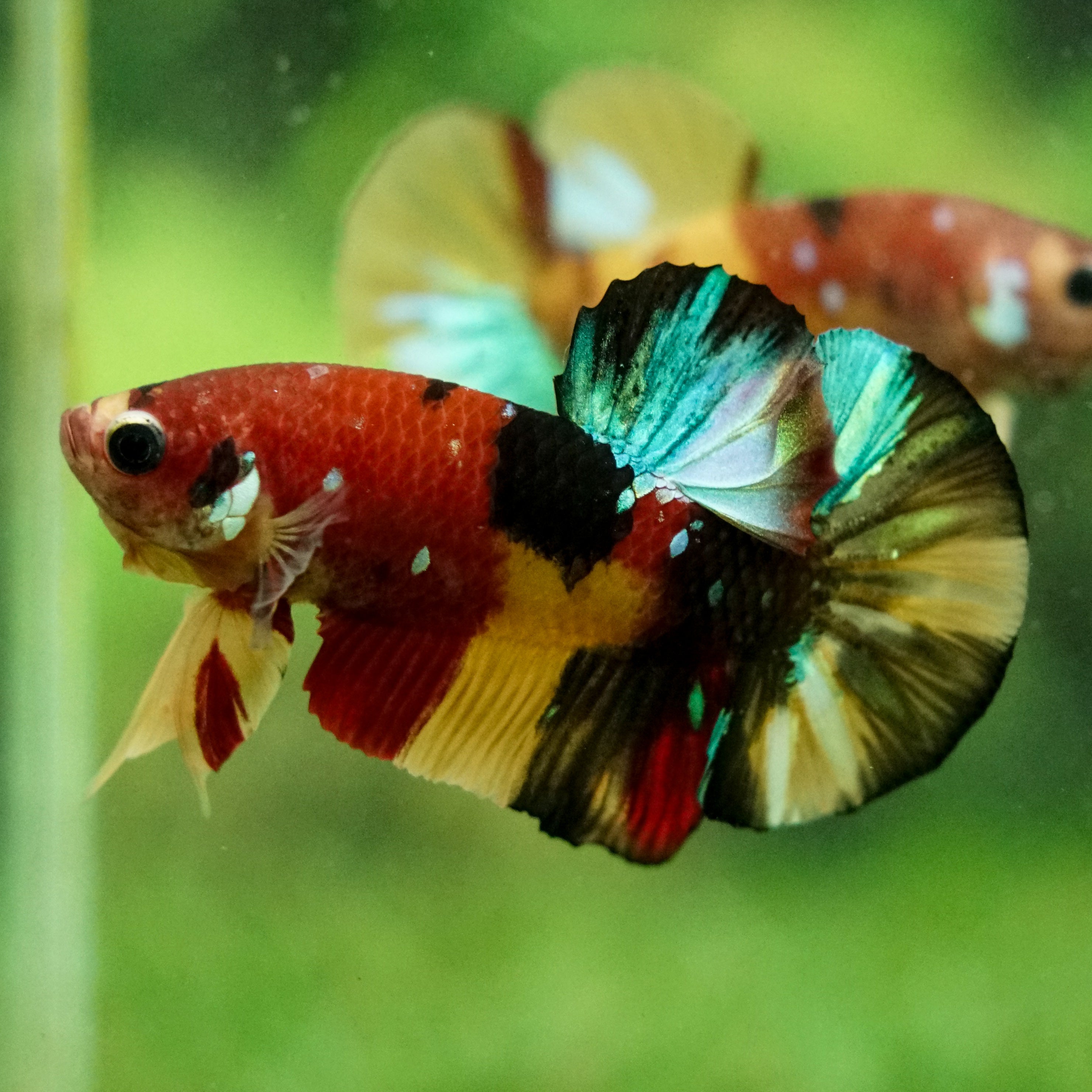 This betta has metallic scales, therefore his/her galaxy scales will appear/shine slightly different under different lighting angles