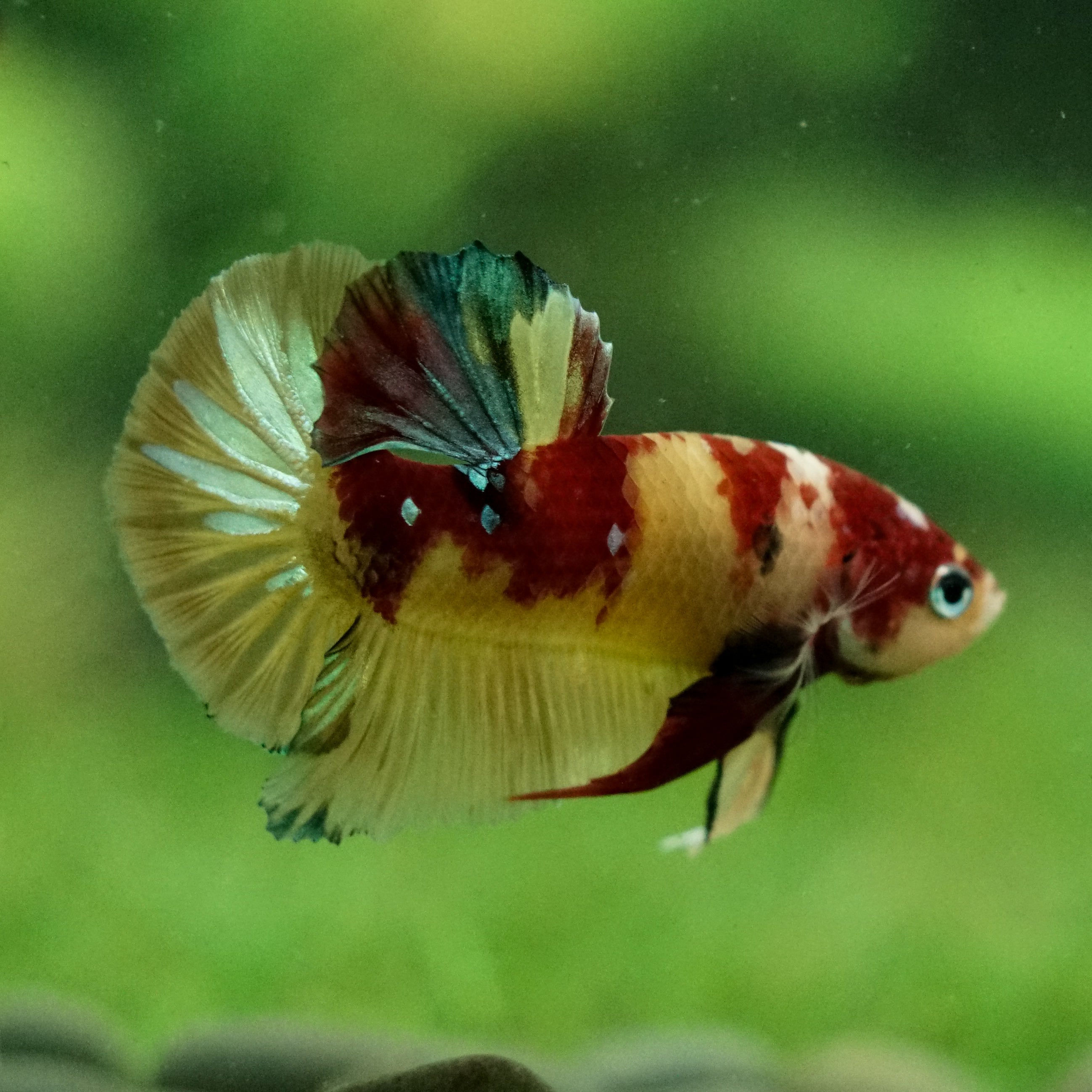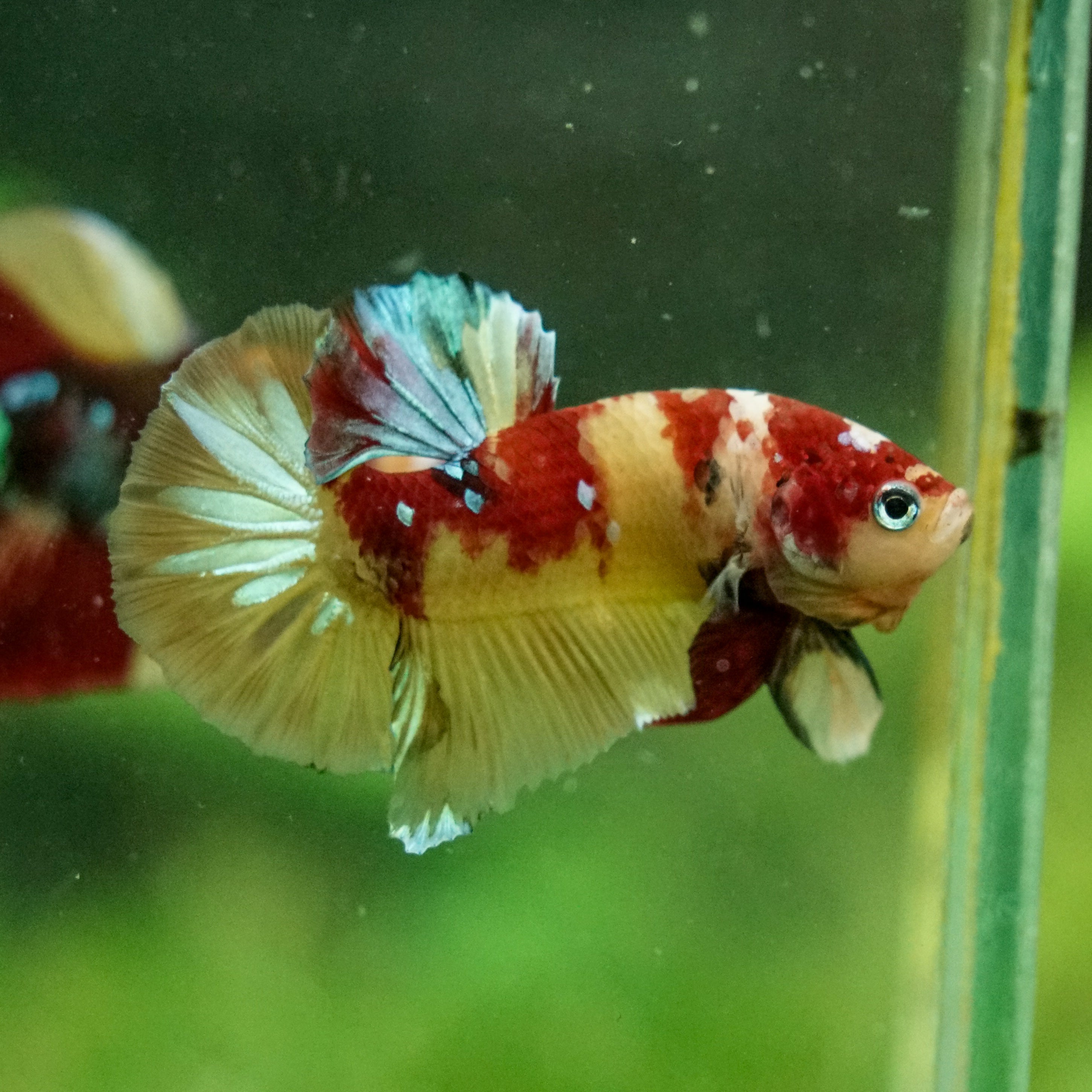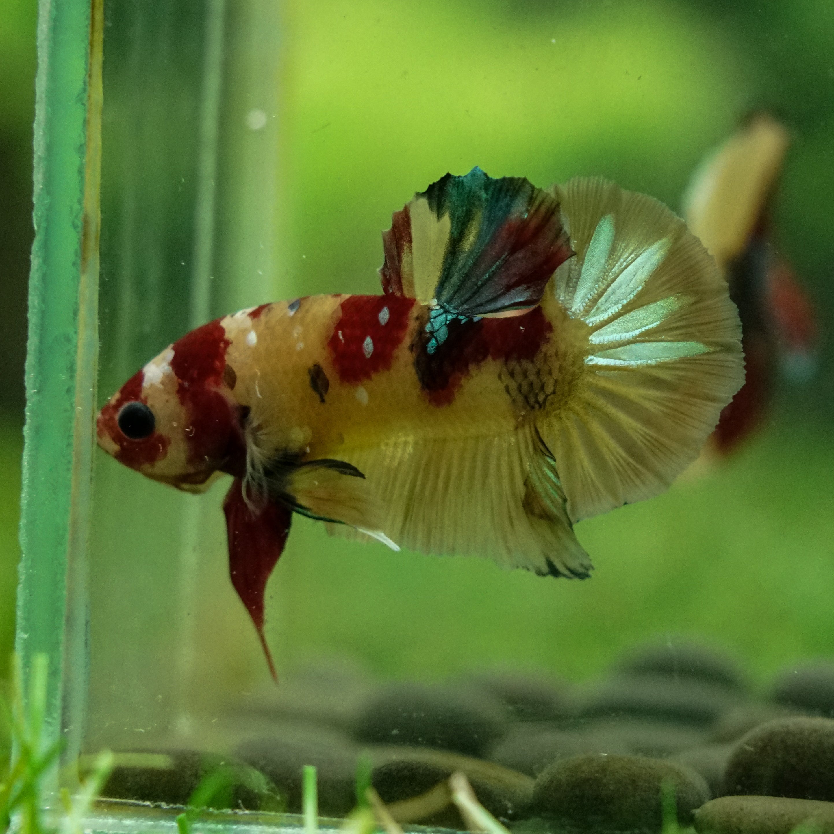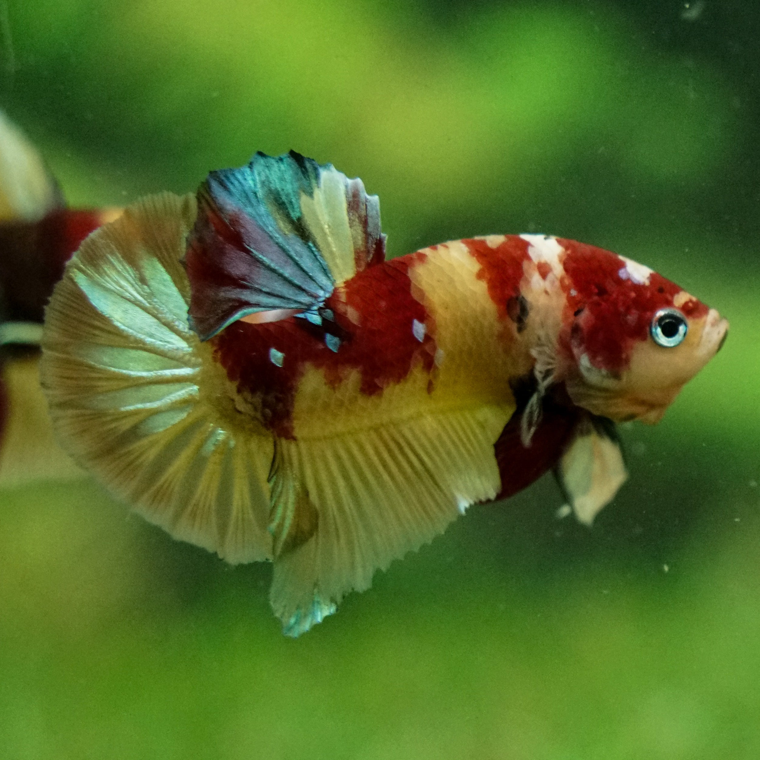 This betta has metallic scales, therefore his/her galaxy scales will appear/shine slightly different under different lighting angles